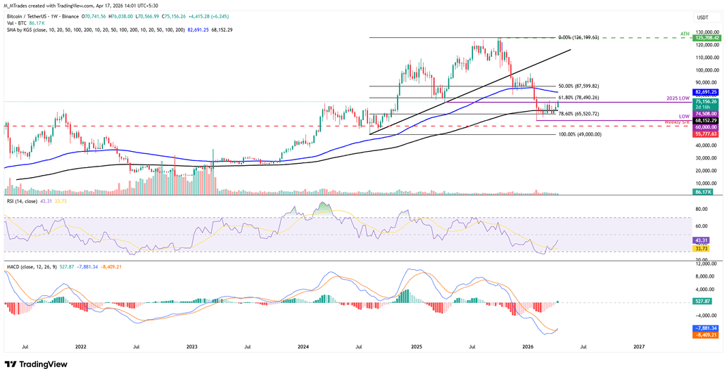 On the topside, a sustained close above the 100-day EMA around $75,280 and the nearby $75,680 horizontal resistance would open the door toward the 50% retracement at $78,962 and the psychological $80,000 mark.