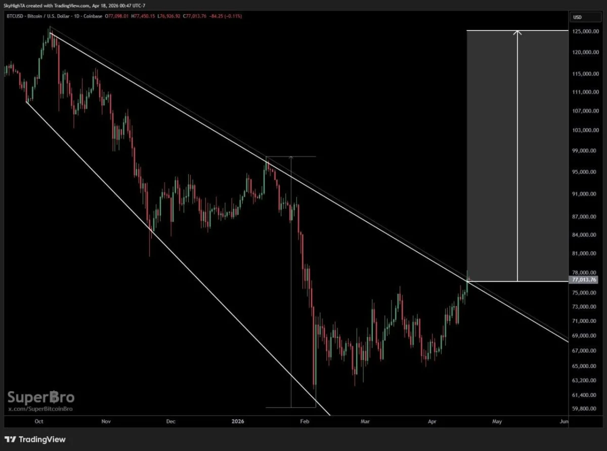 SuperBro’s chart projects a measured move toward all time highs if that breakout holds. The target box begins around the breakout area and stretches toward the $125,000 region, while the label also points to a possible return above the previous peak first. In that sense, the chart presents two bullish ideas at once: first, reclaiming the wedge resistance as support, and second, extending the move toward record territory.