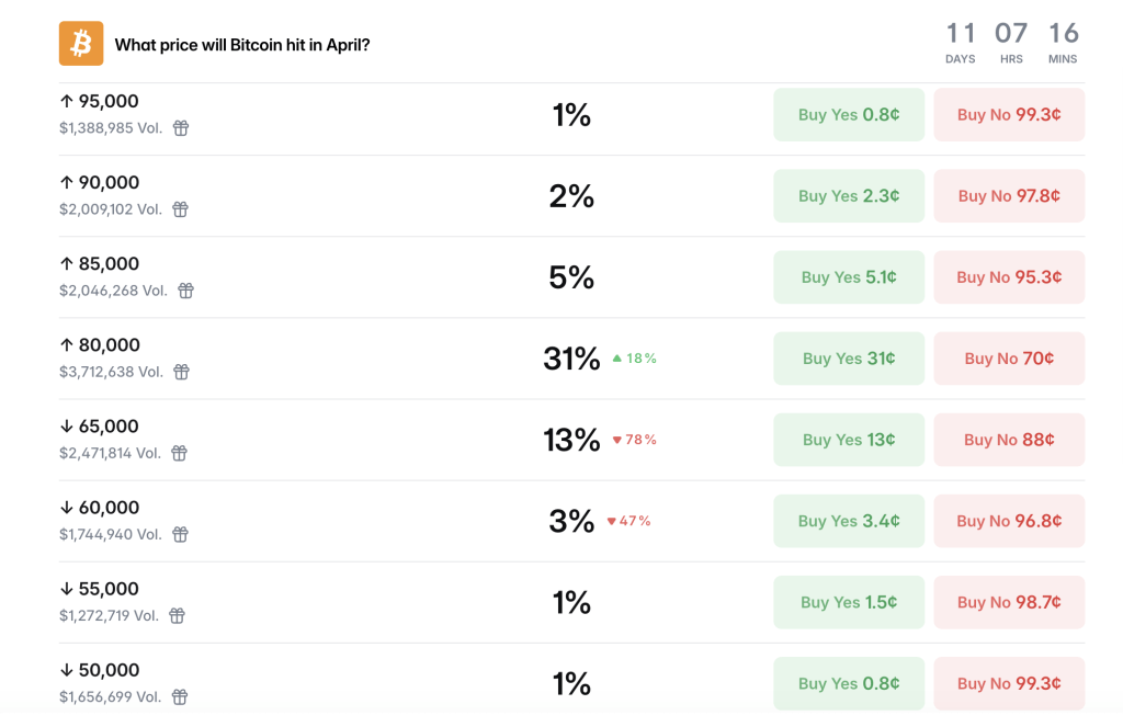 - Polymarket shows a 31% chance bitcoin hits $80K in April 2026, making it the most active live bracket with $3.7M in volume.