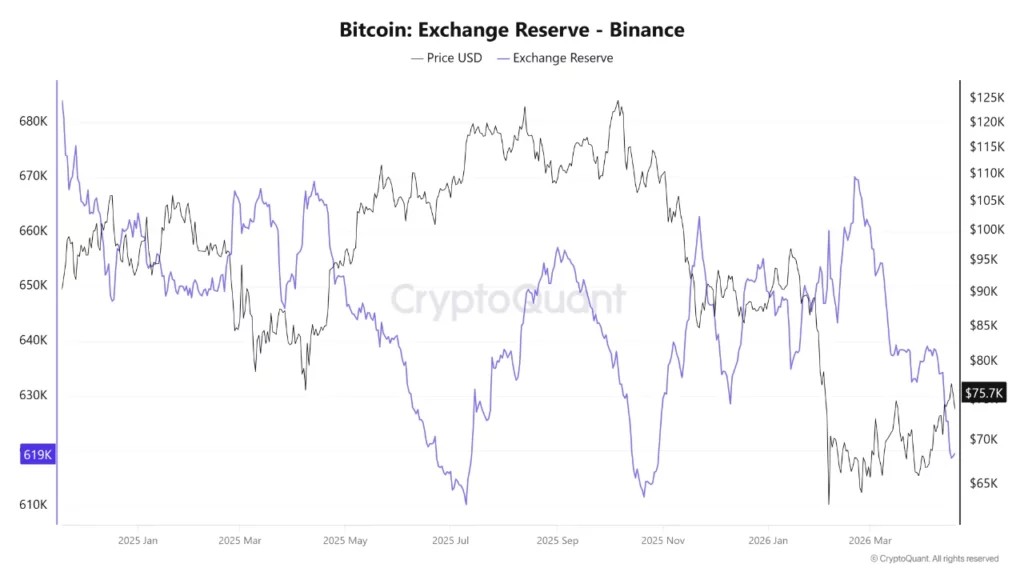 Bitcoin reserves on Binance have dropped to about 619,000 $BTC, their lowest level since October 2025, according to CryptoQuant analyst Arab Chain.