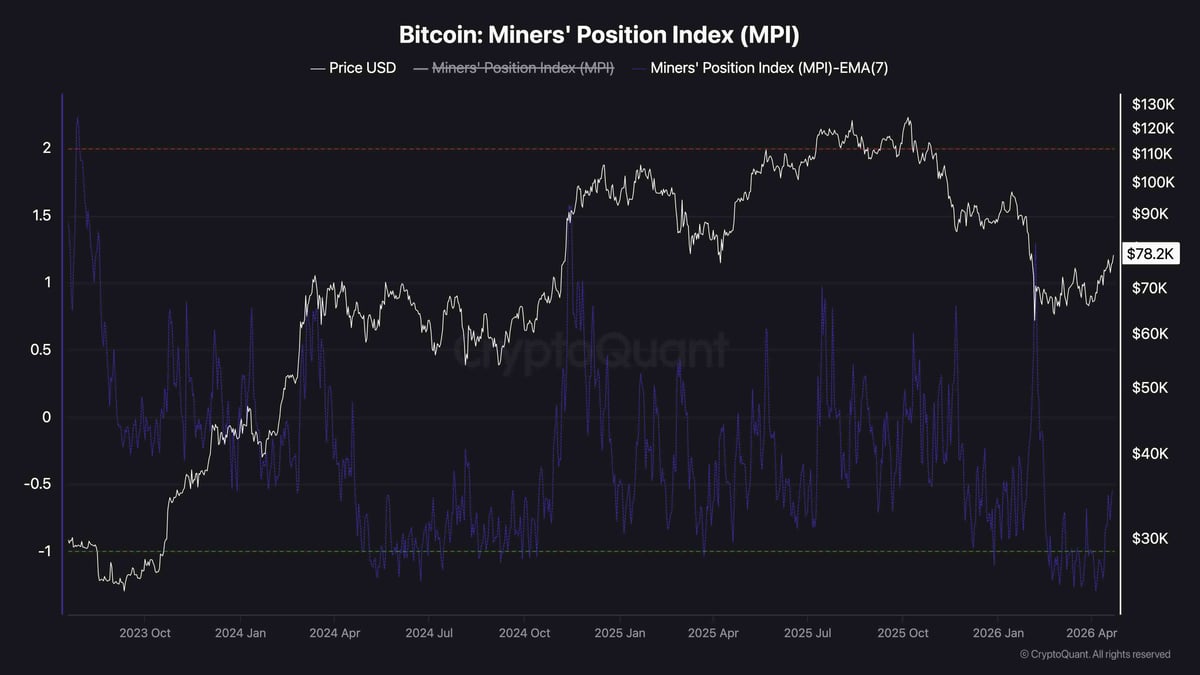 The contrast with prior cycle behavior is meaningful. When the price was trading between $110k and $125k, the MPI was consistently elevated. Miners were offloading supply into demand. At $78k, with the index near its most conservative reading in over a year, miners appear to be holding their coins rather than taking profits. This reduces one of the most consistent sources of sell-side pressure in the Bitcoin market, and in a context where exchange reserves are also at multi-year lows, the supply picture heading into a potential push toward $80k looks considerably cleaner than it did at equivalent price levels during the previous rally.