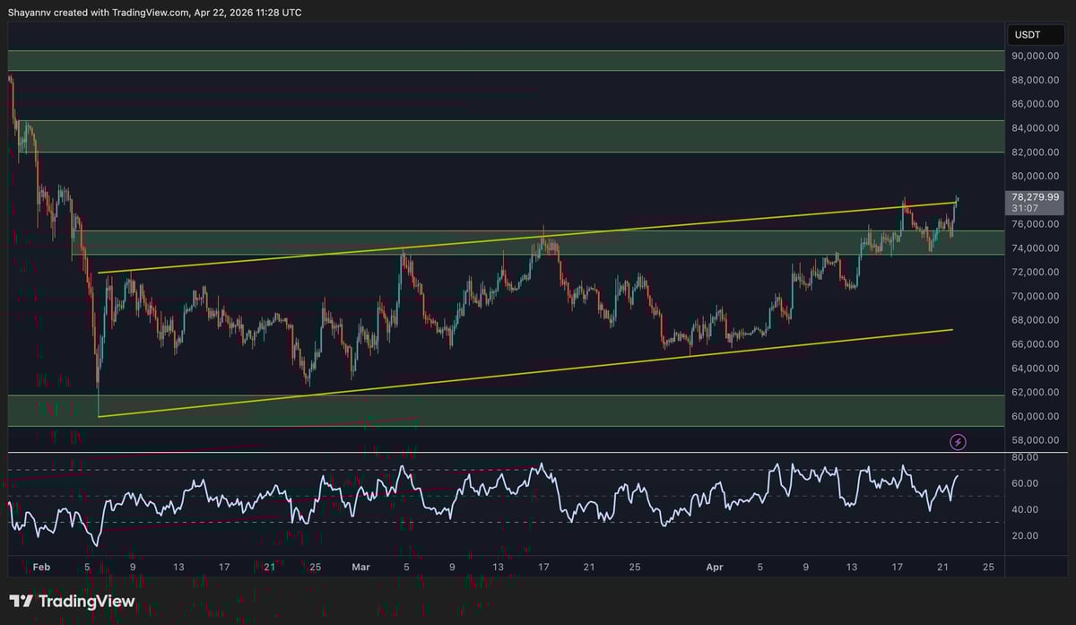 The ascending channel from the February lows is not producing a clean breakout to the upside. $BTC is pushing through the upper boundary near $78k. Unlike the mid-March attempt and last week’s failed breakout, this move has shown genuine follow-through and momentum, which the RSI confirms by trending higher.