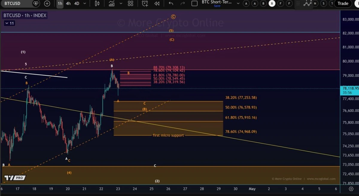 The chart places the first micro support area between roughly $74,968 and $77,253. This zone includes several Fibonacci retracement levels, which makes it an important area for buyers to defend if the broader bullish structure is to remain intact. A hold inside that range would support the idea that the current drop is a correction within a larger upward move.