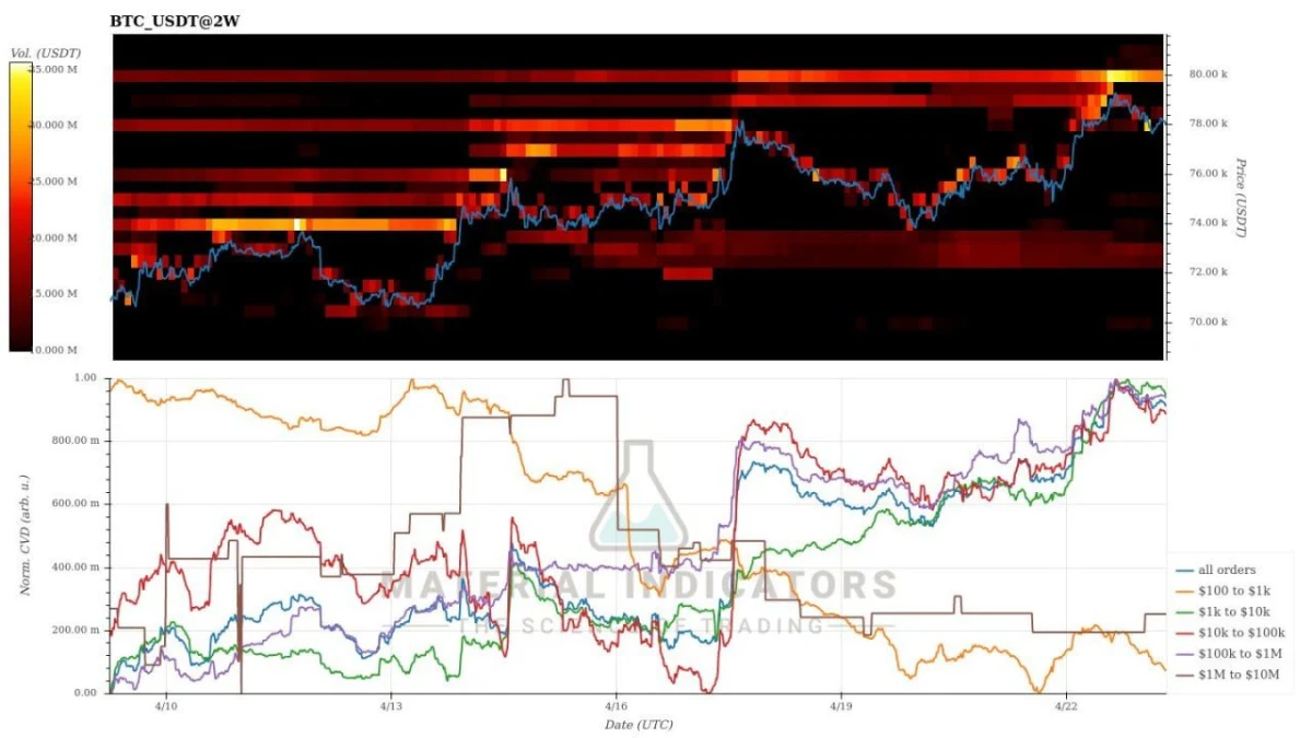 Bitcoin is trading just below a strong sell wall near $80,000, while the CVD data shows no major shift from larger holders. The chart shared by CW suggests that recent upside did not come with aggressive whale participation. Because of that, the market still lacks a strong signal that big players are ready to push price through resistance.