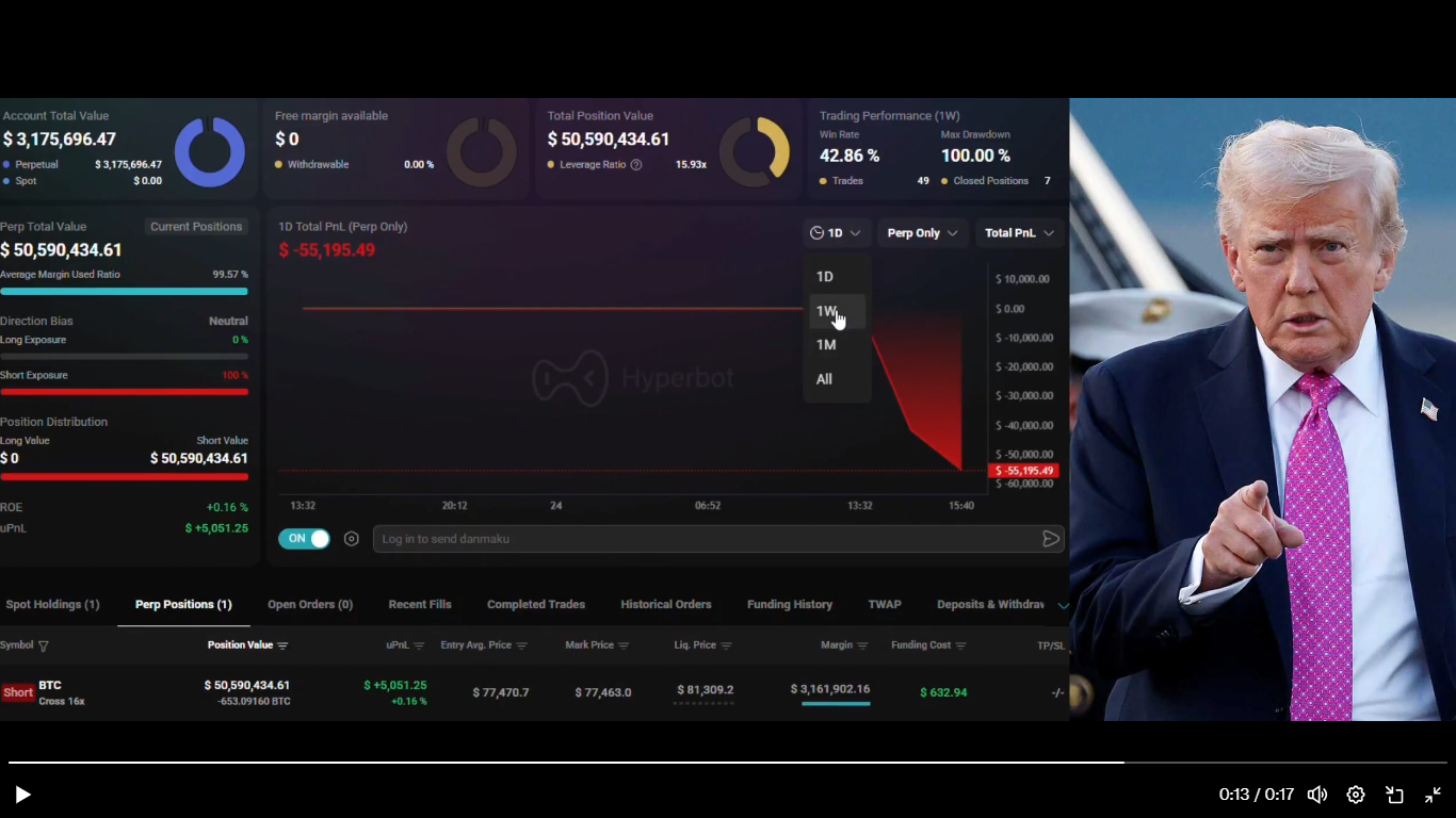 An anonymous trader has opened a massive $50.6M short position on $BTC perpetual futures on the Hyperliquid decentralized exchange. The large leveraged bet visible in the 10-16x range based on dashboard metrics appeared shortly before President Trump’s scheduled keynote speech the following day.