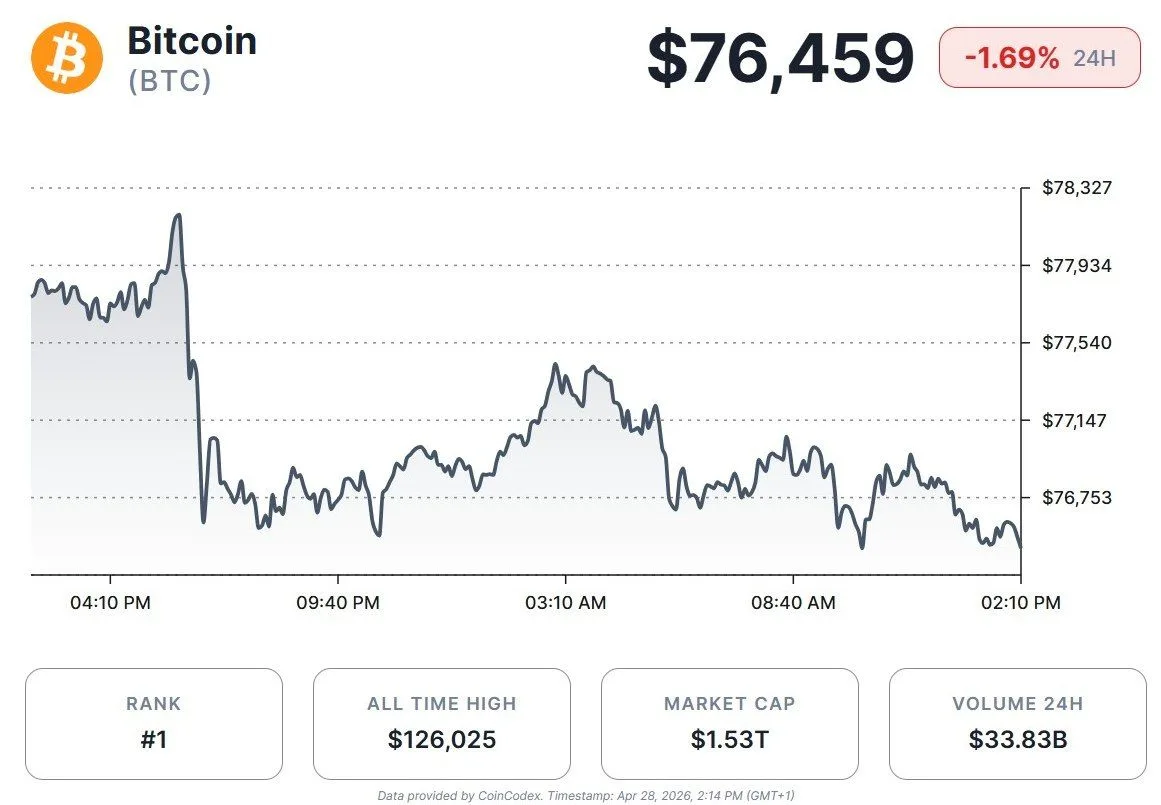Bitcoin fell about 2% in the past 24 hours and traded near $76,438. Its 24-hour low stood at $76,384, while the high reached $79,327. Meanwhile, $BTC trading volume increased by almost 40% during the same period.