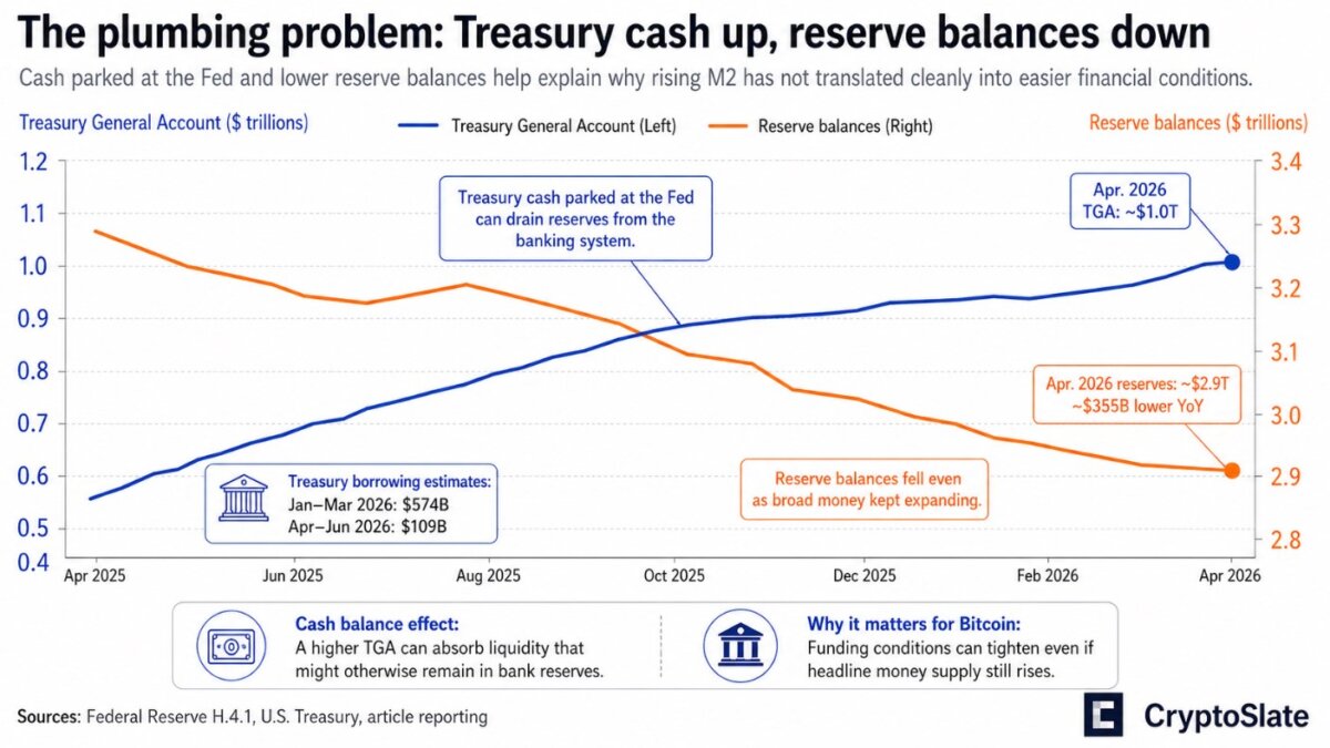 The Treasury General Account, which sits at the Federal Reserve, held roughly $1 trillion in the latest H.4.1 data. Cash parked at the Fed drains reserves from the banking system even as M2 continues to tick up.