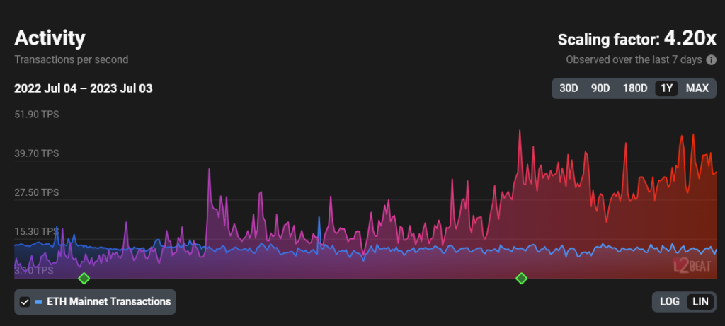 Further, reviewing the top 10 Ethereum L2s shows Arbitrum One and zkSync Era closing in on Ethereum’s monthly transaction count. Additionally, Immutable X and Arbitrum Nova have surpassed Ethereum’s growth in average transactions per second (TPS) over seven days. Notably, Ethereum had a higher active TPS than any L2 scaling solution on the network on July 3.