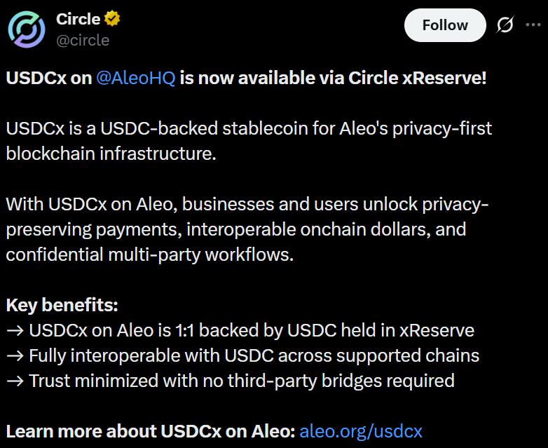 Circle and Aleo announced Tuesday that USDCx on Aleo is now available via Circle’s xReserve, a reserve-backed issuance model that allows USDC (USDC) to be represented on additional blockchains without relying on third-party bridges.