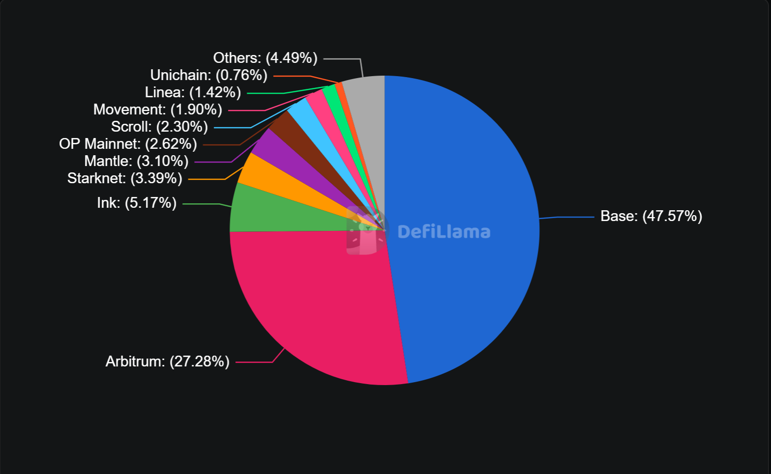Arbitrum (ARB) now controls 27% of the layer-2 market, ranking it a distant second behind Base, while all other networks remain limited to single-digit shares.