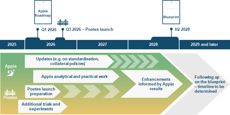 The roadmap is built around two linked initiatives. Pontes is the Eurosystem’s distributed ledger technology settlement solution, while Appia is the broader strategic framework for developing a future tokenized financial ecosystem. The ECB said Pontes is scheduled to launch in the third quarter of 2026.