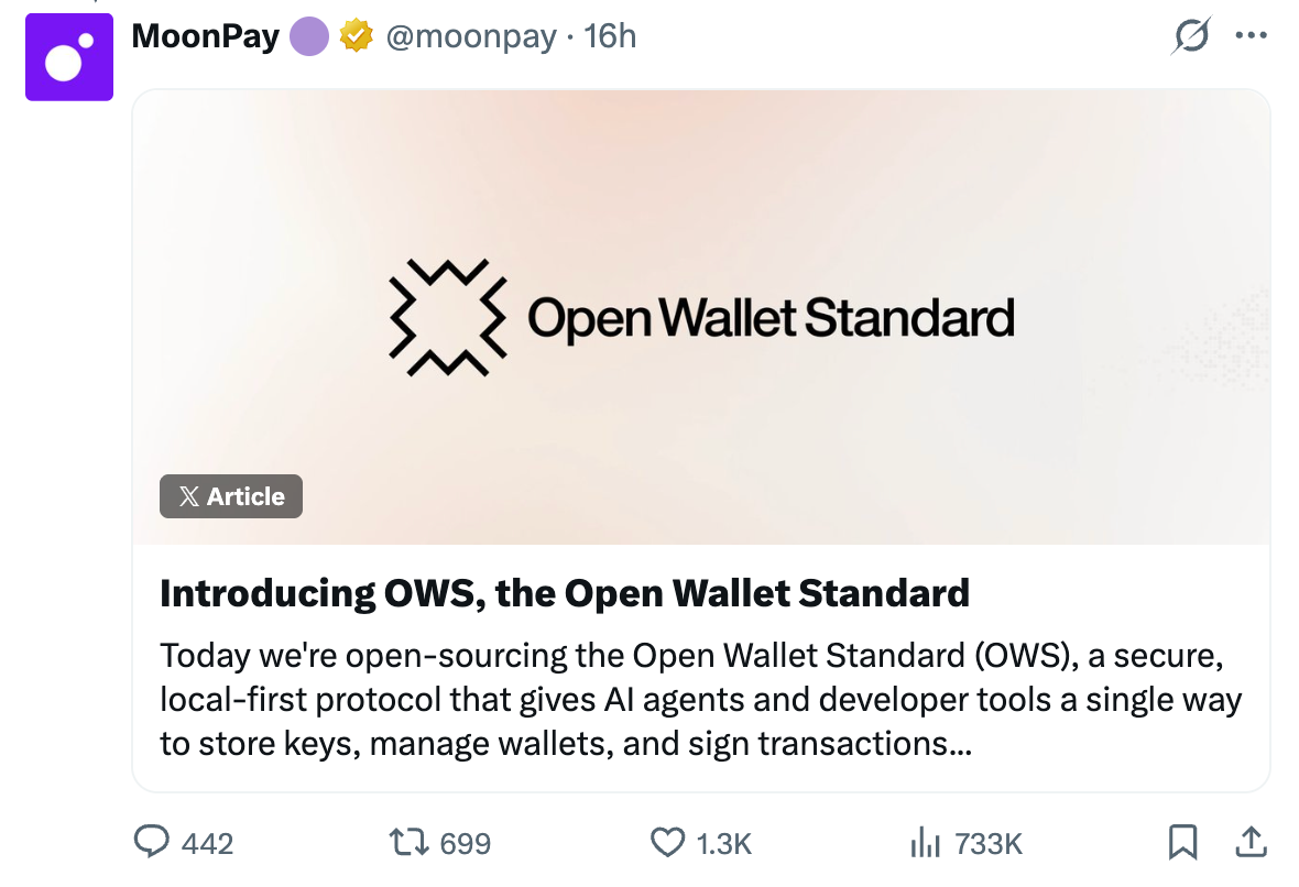 Known as the Open Wallet Standard (OWS), it was developed by the crypto payments company MoonPay and open-sourced. It serves as a secure, local-first protocol that enables agents to store keys, manage wallets and sign transactions on most major blockchains.
