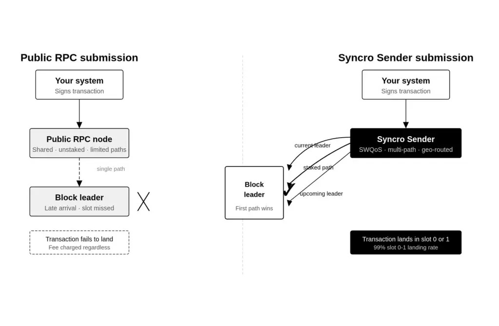Multi-path delivery to current and upcoming leaders. Rather than relying on a single submission path, Syncro Sender sends transactions simultaneously through multiple routes: directly to the current block leader, toward upcoming leaders identified through the leader schedule, and through staked validator connections in parallel. Whichever path reaches the leader first determines the outcome. The others become redundant. Independent 2025 benchmarks of Solana transaction endpoints confirmed that without SWQoS and well-placed infrastructure, even high-fee transactions consistently land in the seconds range. Multi-path delivery through staked connections pushes teams into sub-second territory, which already places them ahead of the majority of network traffic.