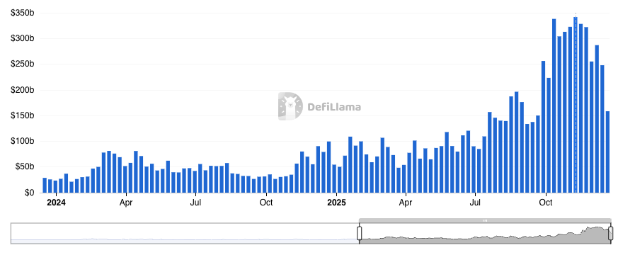 The top five perp DEXs by volume are each processing between $19 billion and $48 billion in weekly volume, more than double Hyperliquid’s weekly average before its token launch in November 2024. The sector reached a new all-time high volume in the first week of November, when more than $340 billion were traded across all perp exchanges in just seven days.