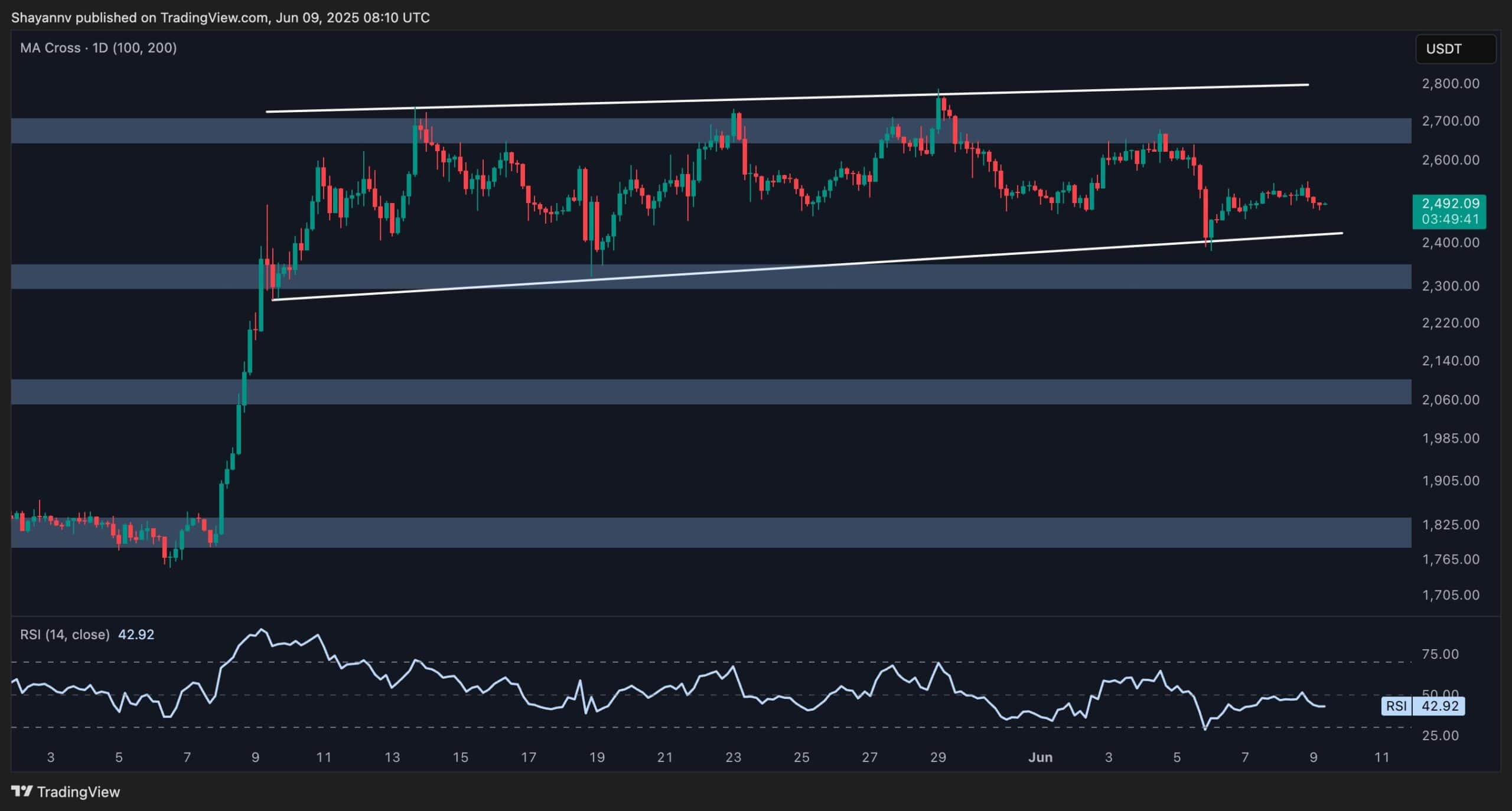 A breakdown from this level would likely initiate a bearish continuation toward the $2.2K support area. Until a decisive breakout occurs, price action is expected to remain choppy within the wedge.