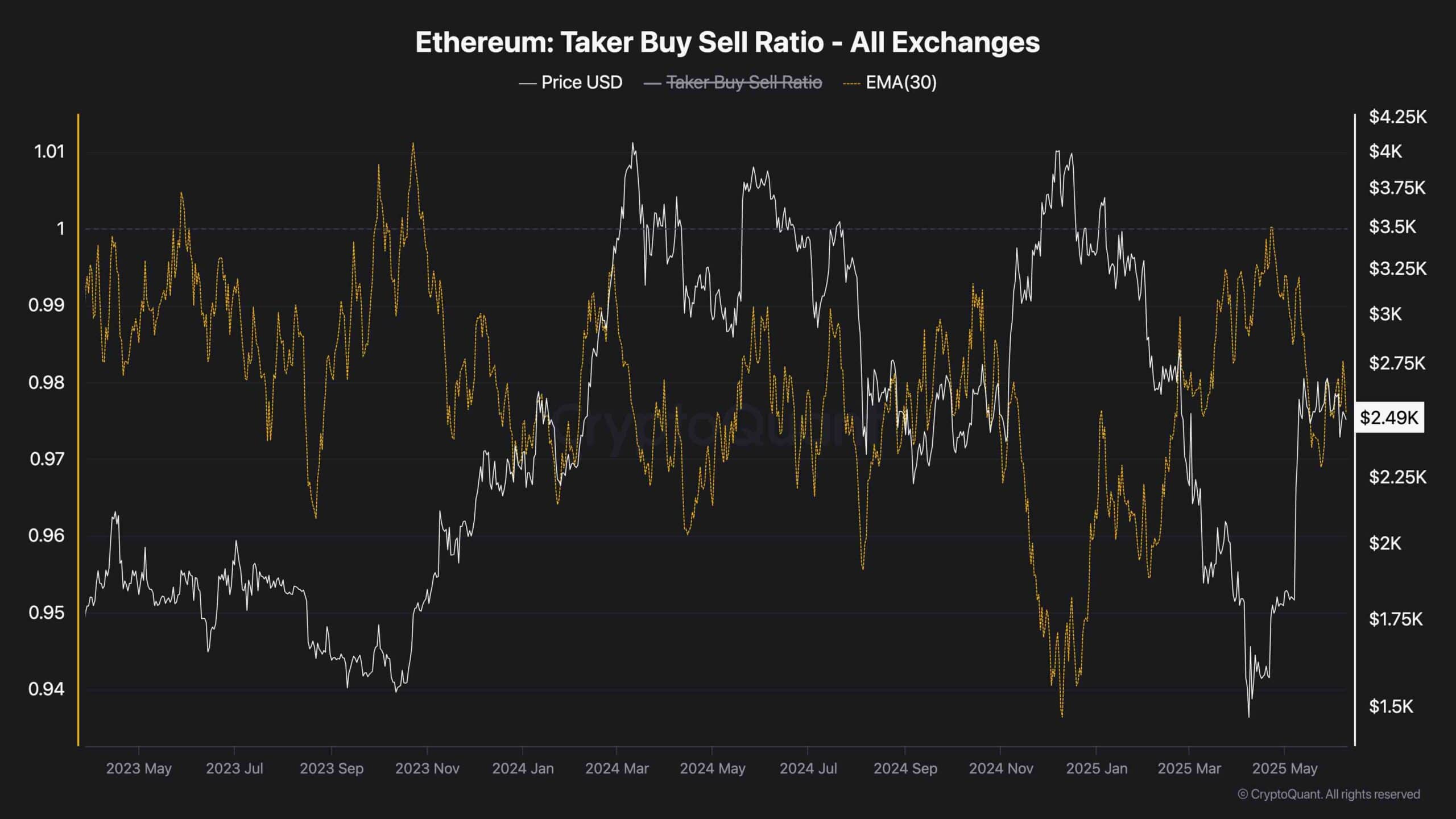 A critical metric to watch is the ETH Taker Buy-Sell Ratio, which tracks the dominance of aggressive market orders, those executed at the current market price, revealing whether buyers or sellers are driving momentum. These orders typically indicate urgency and conviction among traders.