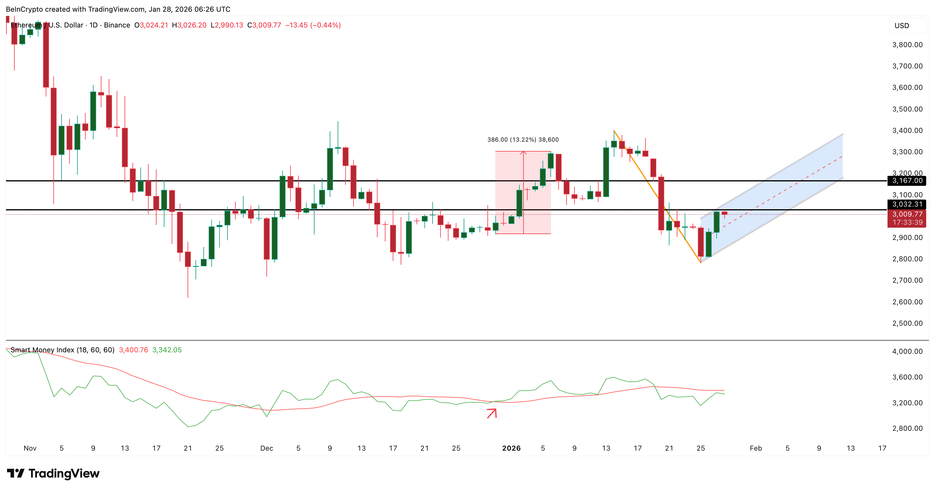 If that neckline is reclaimed with confirmation, the structure opens conditional upside targets near $3,790 and $4,170. A further extension toward $4,410 would require not just price strength, but a material expansion in sentiment and smart-money participation.