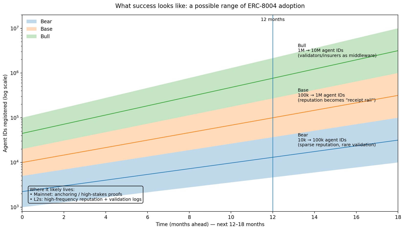 A bear case over 12-18 months sees 10,000 to 100,000 agent IDs registered across chains, with reputation mostly sparse and validation rare.