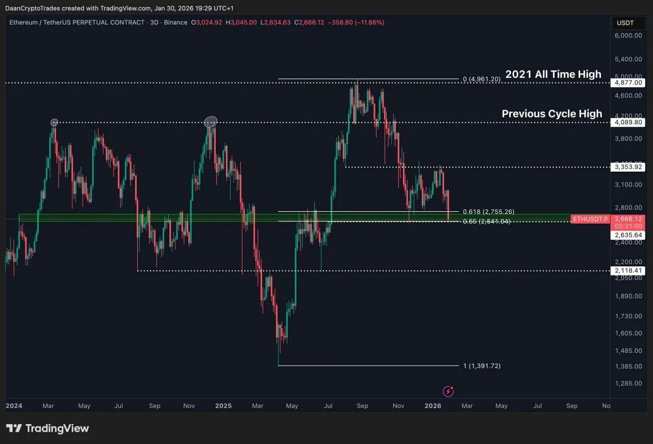 The chart shows $ETH failing to hold above the 0.618 Fibonacci retracement near $2,755 and sliding toward the 0.65 level around $2,641. The rejection from higher levels followed a broader downtrend from the previous cycle high near $4,090 and the 2021 all time high close to $4,960. Sellers regained control as $ETH dropped back below the mid range structure that supported price during the second half of 2025.