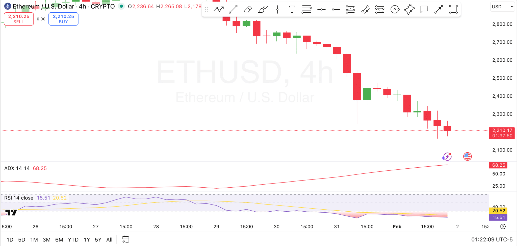 Meanwhile, the Average Directional Index is elevated above 65, confirming that the current trend is strong and well-established to the downside. This combination suggests Ethereum remains firmly in a bearish trend until signs of a reversal appear.