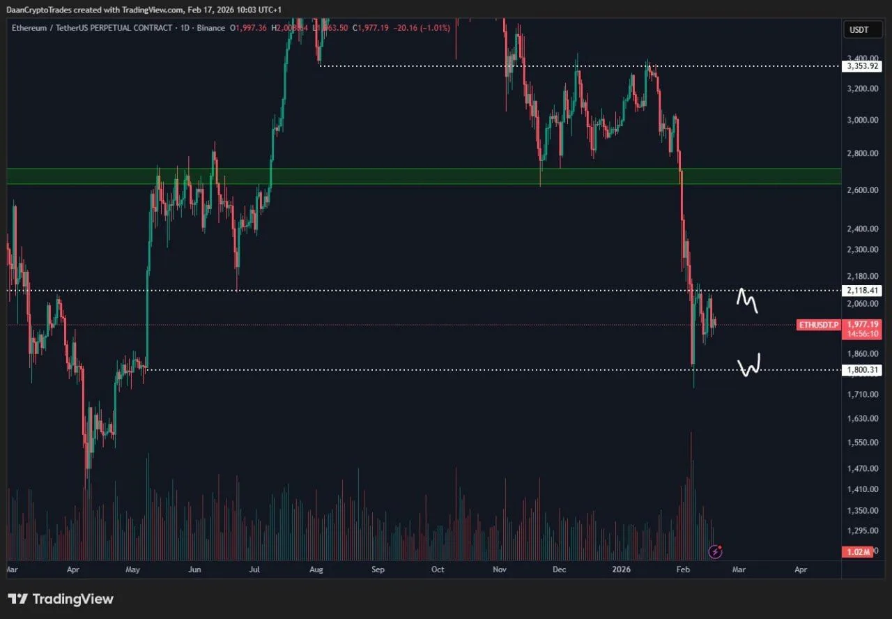 Ethereum traded near $1,977 on Feb. 17 on a daily Binance ETHUSDT perpetual chart, as price held inside a tight band around the $2,000 level after a sharp selloff earlier in the month.