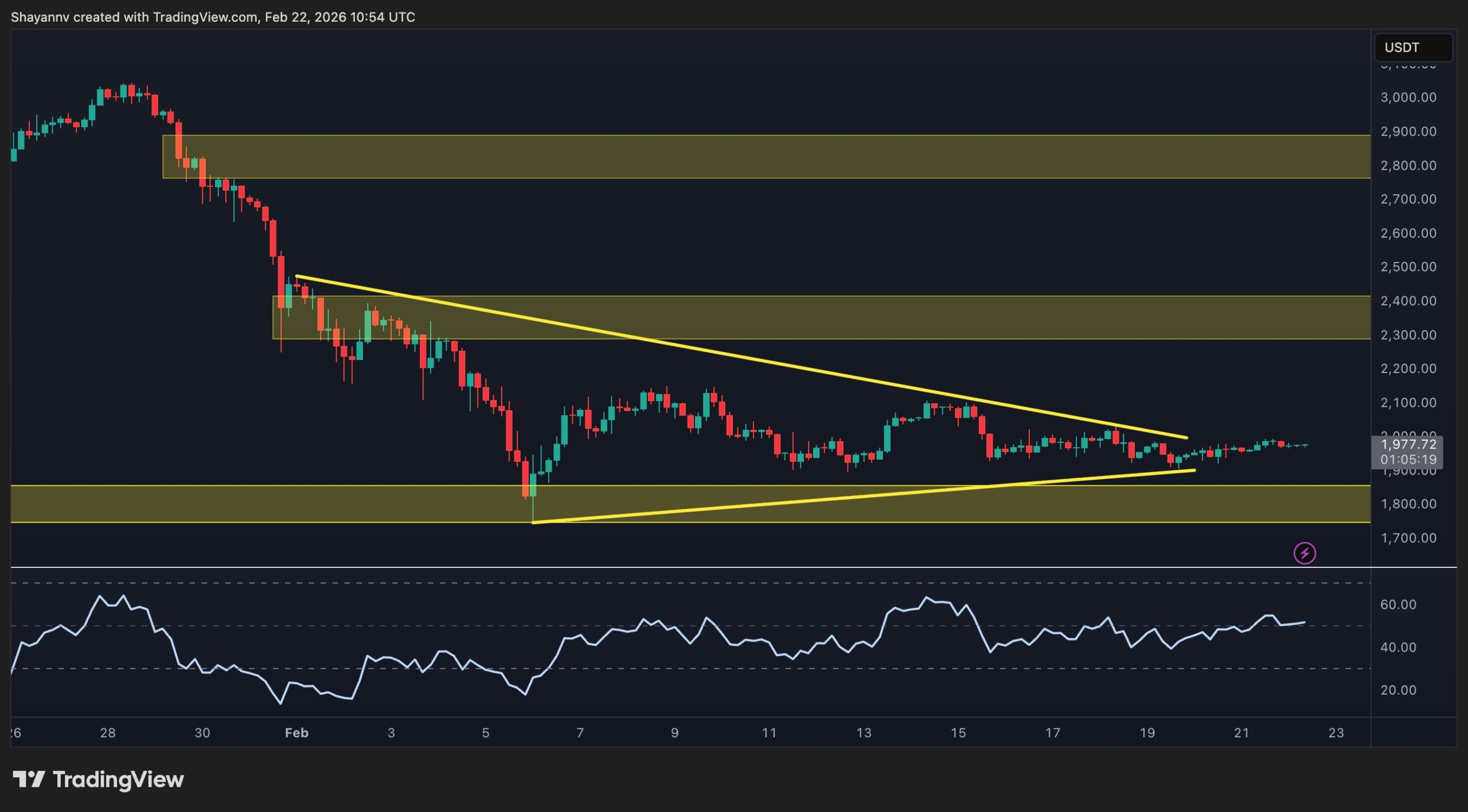 A breakout above $2,000–$2,100 highs would be the first signal of a short-term momentum shift and could open a move toward the $2,300-$2,400 resistance band. Conversely, losing the $1,800 base would invalidate the consolidation thesis and likely trigger renewed downside pressure toward deeper support levels.