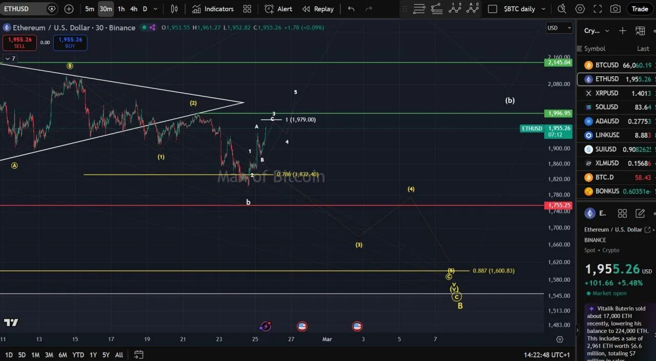 Ether traded near $1,955 on the ETHUSD 30 minute chart after a rebound that the analyst behind Man of Bitcoin called uneven. In a post on X, the account said it reads the move as “wave c of 3” and set an “ideal” upside target near $1,979.