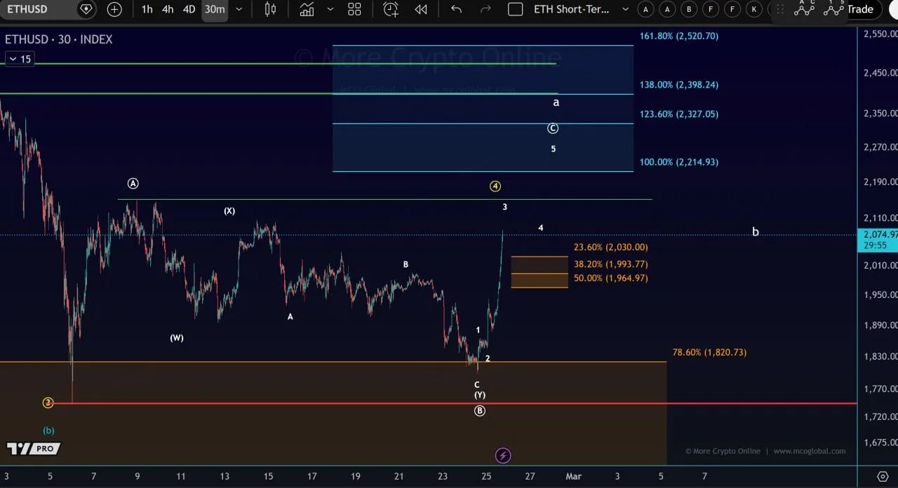 Ether’s rebound on the ETHUSD 30 minute chart showed a sharp recovery from a recent swing low, according to analysis shared by More Crypto Online on X. The analyst said the structure forced an adjustment to near-term support, placing the micro support band between $1,964 and $2,030 as the zone price needs to defend to keep the short-term structure intact.