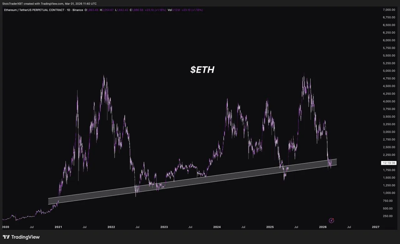 Ethereum traded near $1,986 as traders focused on a long running support band that has framed price action since 2020. A TradingView chart created by StoicTraderXBT on March 1 showed $ETH sliding back toward the lower edge of a rising “macro range” zone, with the latest candles testing the same area that previously acted as a floor after major selloffs.