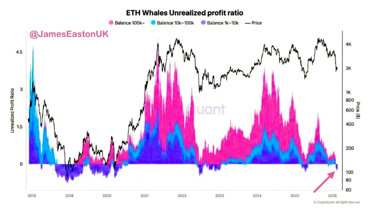 Onchain data shows several large Ethereum holder groups moving into unrealized losses as $ETH trades near the $2,000 level. A CryptoQuant chart shared by James Easton tracks the $ETH Whales Unrealized Profit Ratio across wallets holding 1,000 to 10,000 $ETH, 10,000 to 100,000 $ETH, and more than 100,000 $ETH. The latest readings place multiple cohorts slightly below the zero line, meaning their average cost basis now sits above market price.