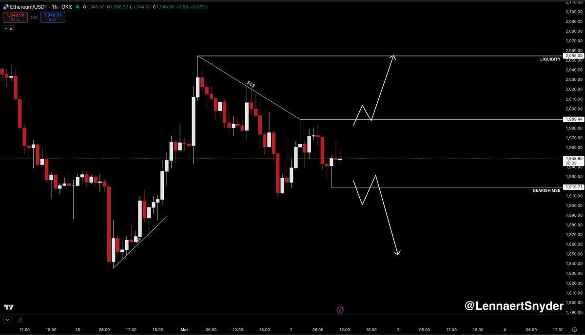 On the 1-hour timeframe, $ETH price has been squeezing further into a compression, according to crypto trader Lennaert Snyder. As such, the Ethereum price must rally above $1,989 to confirm a bull run or break below $1,919 to signal bearish continuation.