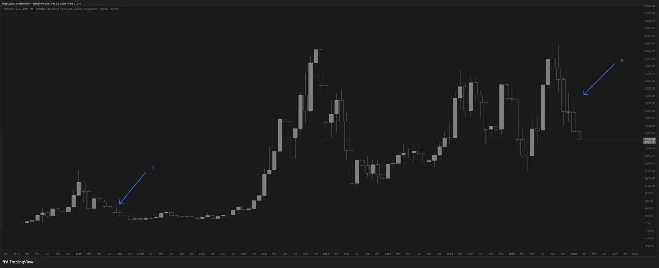 Ethereum posted its sixth consecutive red monthly candle, a pattern that has appeared only once before in its trading history. According to market commentator Tyler Durden on X, Ethereum recorded six or more straight monthly declines only during the 2018 bear market. At that time, the seventh red candle marked the cycle bottom.