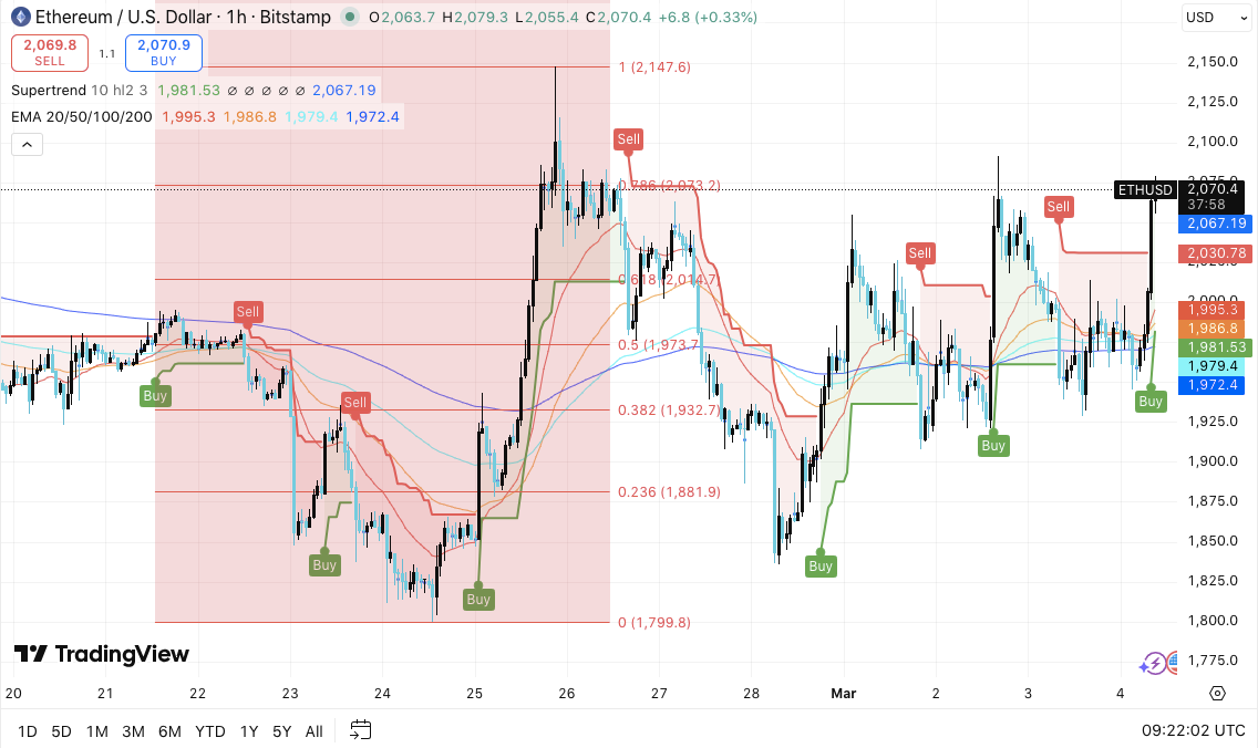 Short-term charts show Ethereum breaking above the 0.786 Fibonacci retracement near $2,073. Consequently, price reclaimed major moving averages that previously limited upside momentum.