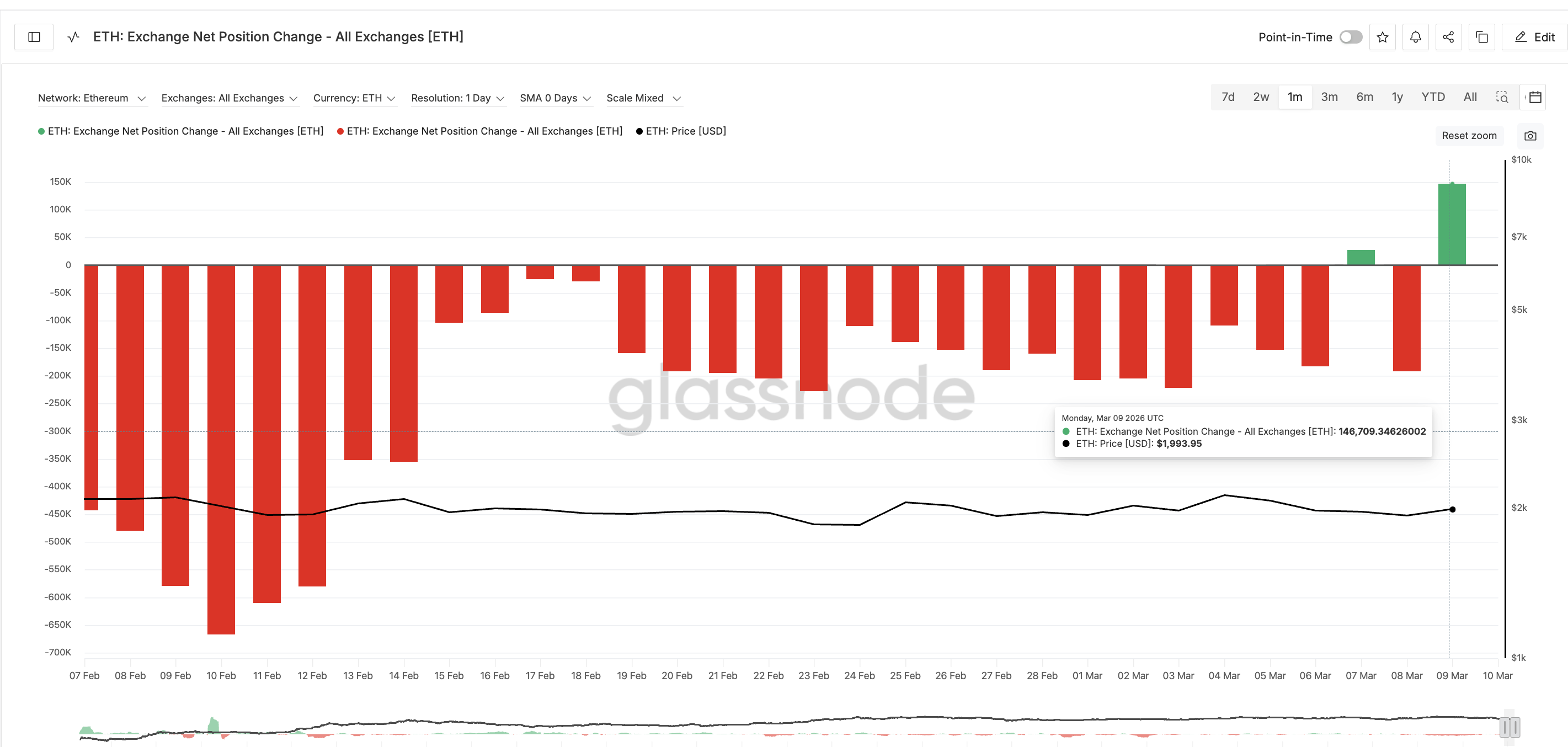 During the previous rally between March 1 and March 4 (post-divergence), Ethereum experienced continuous exchange outflows. The Exchange Net Position Change remained negative, signaling that coins were leaving exchanges, a sign of sustained buying pressure.