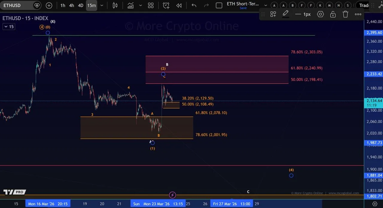 ETHUSD 15 Minute Elliott Wave and Fibonacci Resistance Setup: Source: More Crypto Online on X