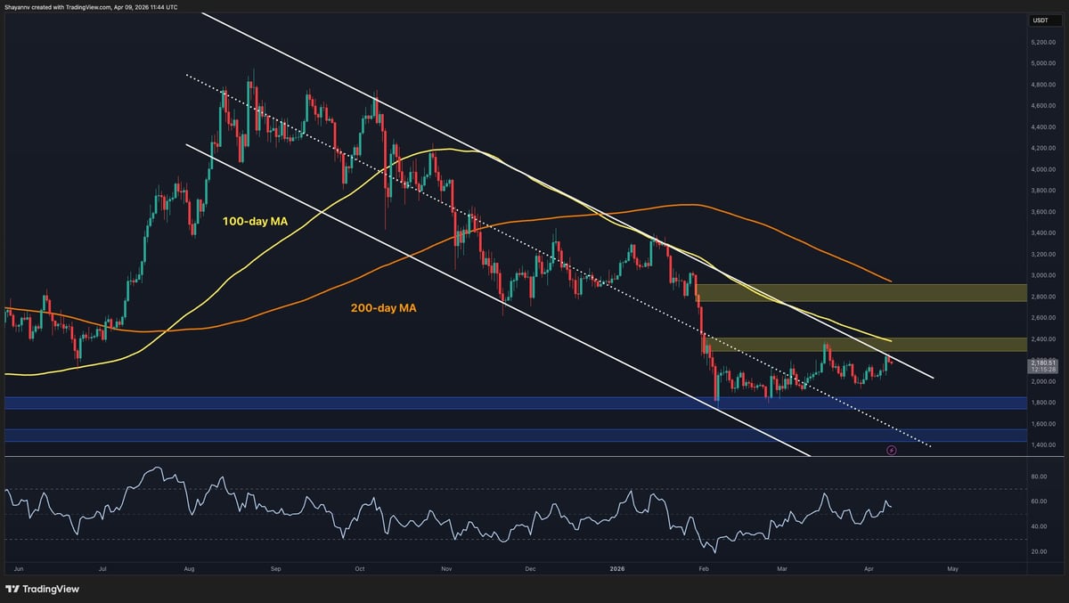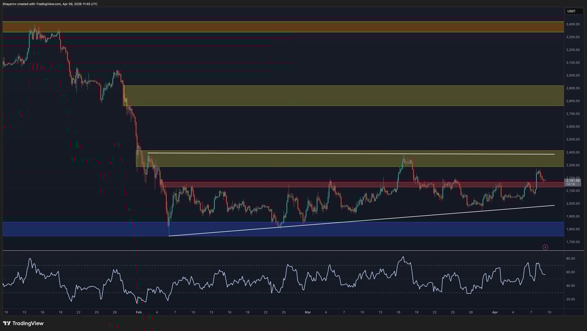 Ethereum is trading below $2.2k as the second week of Q2 gets underway. The asset is caught between a slowly improving short-term structure and a daily chart that remains firmly in bearish territory. $ETH has managed to hold above the critical $1.8k support zone since the February lows, but the recovery has been choppy and unconvincing.