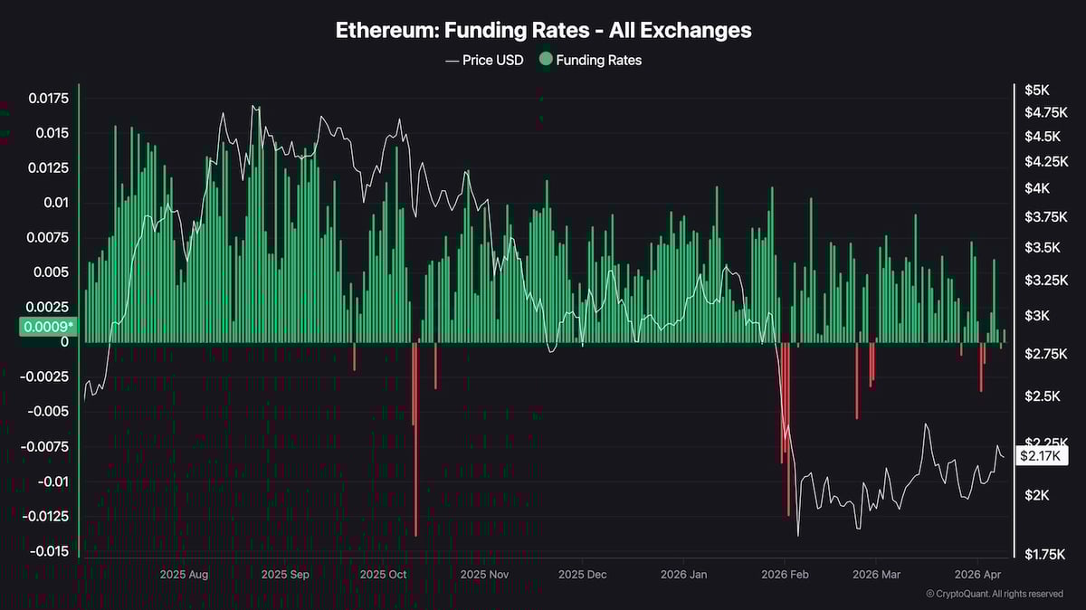 Positive funding is technically still the dominant reading, but the shrinking magnitude and intermittent red bars point to a derivatives market that remains uncertain rather than directionally committed, which aligns with the choppy, range-bound price action seen on the charts.