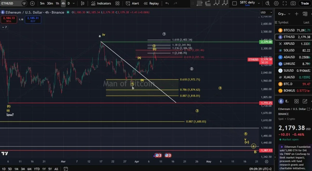 That matters because the rally is still presented as wave 2 within a larger bearish count. In other words, the current move higher may only be a temporary recovery before another leg lower starts. The chart keeps that bearish roadmap active unless Ethereum clears the $2,402 area and weakens the current wave count.