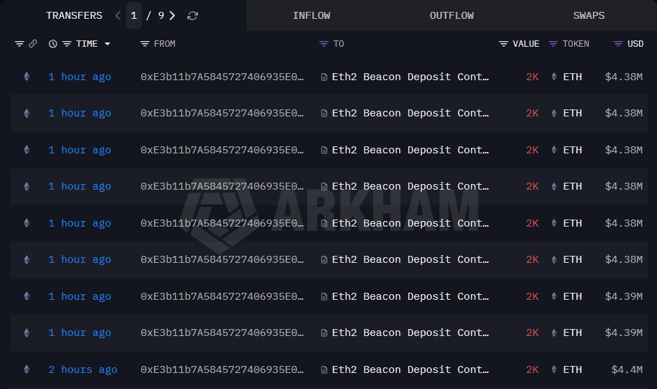 Large holders lock supply, with repeated 2,000 $ETH deposits into the Beacon Contract and one wallet staking 18,000 $ETH worth $39.45 million, reducing liquid supply further.