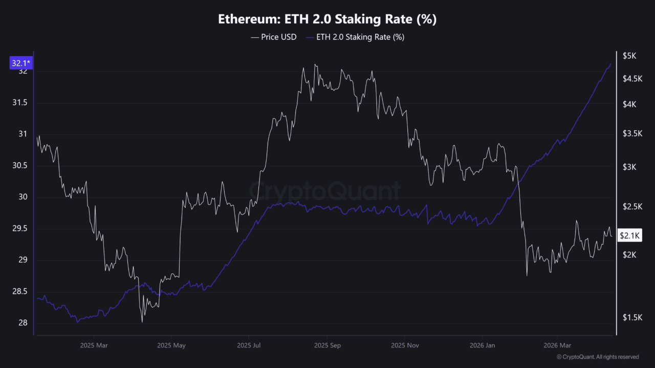 According to CryptoQuant data, the staking ratio rose to 32.1%, with nearly 39 million $ETH moving into validators, signaling a clear shift toward long-term holding. This occurs because participants seek yield and network participation as volatility stabilizes.