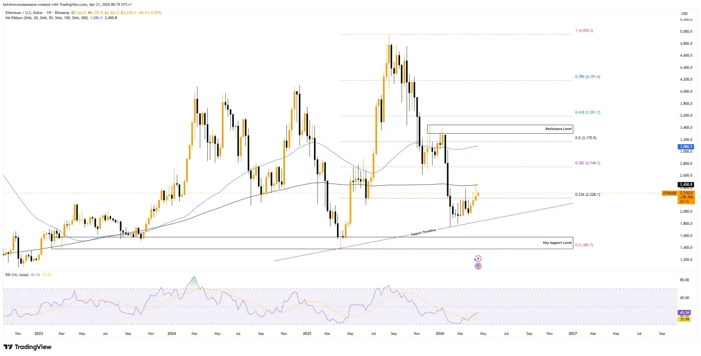 Ethereum entered a fourth straight bullish week, turning a previous technical setback into a measured rebound. The move followed a rejection near the 23.6% Fibonacci level around $2,228, which had triggered an 18% fall to about $1,937.