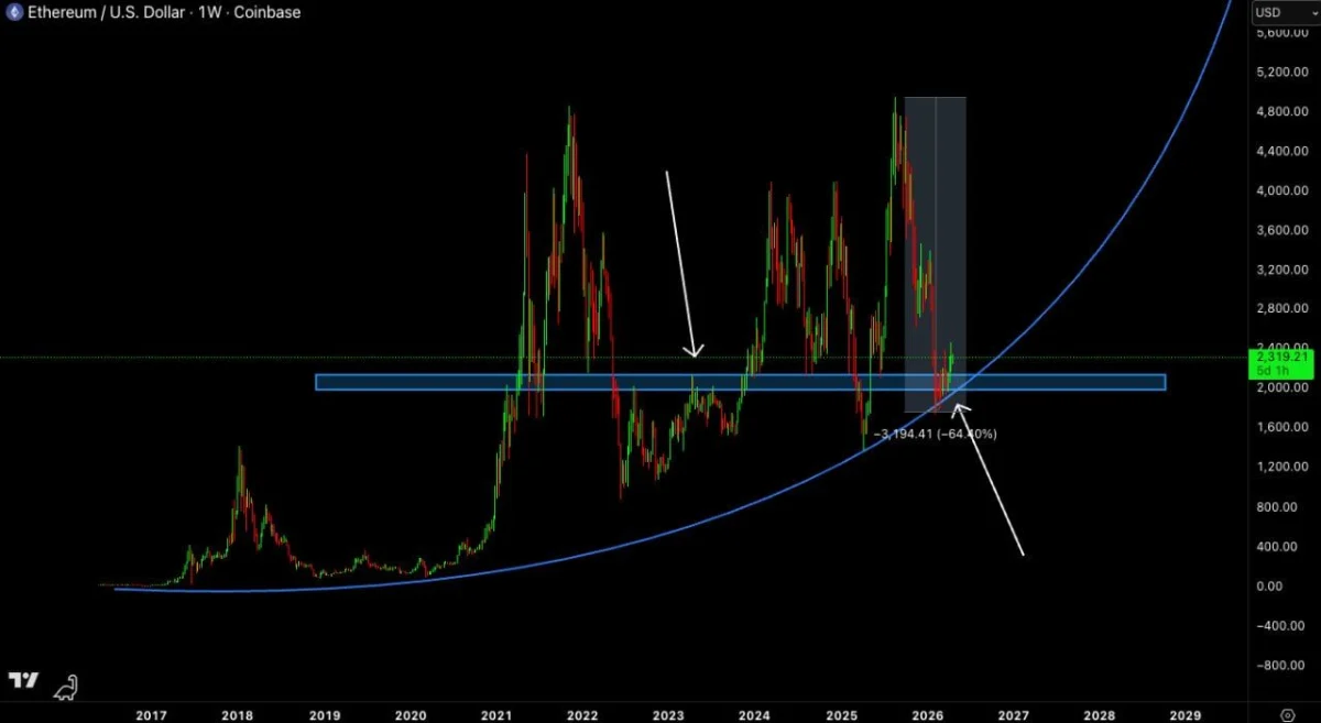 The chart argues that many traders may overlook this area even though Ethereum is back at a zone that has supported price in past cycles. It also shows $ETH holding above the blue support band for now, which keeps the recovery case alive. In that view, the current pullback looks more like a retest of support than a confirmed breakdown.