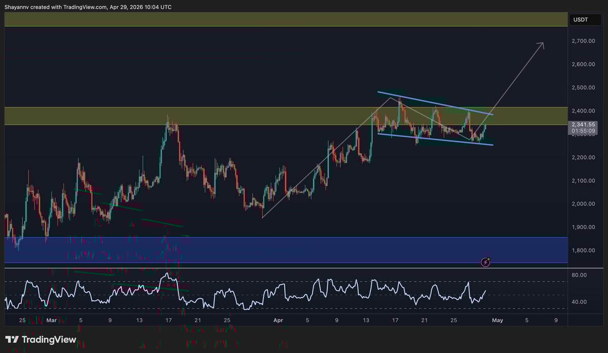 Ethereum is trading at $2,340 as April closes out, having quietly done what it failed to accomplish for the better part of six months: break out of the descending channel that has defined its entire corrective structure since October 2025. The breakout is fresh, unconfirmed on higher timeframes, and happening right below the $2.4k resistance zone.