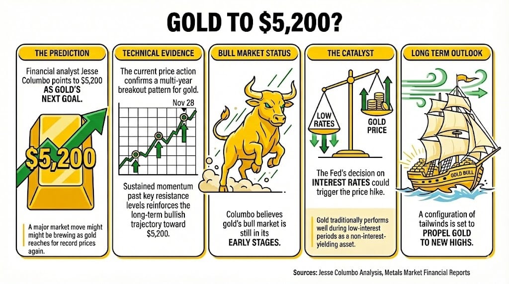 Jess Colombo, a metals financial analyst, claims that the recent moves might hint at a large gold breakout in the short term. He states that the preliminary breakout that occurred on November 28 points toward $5,200 as a new price target.