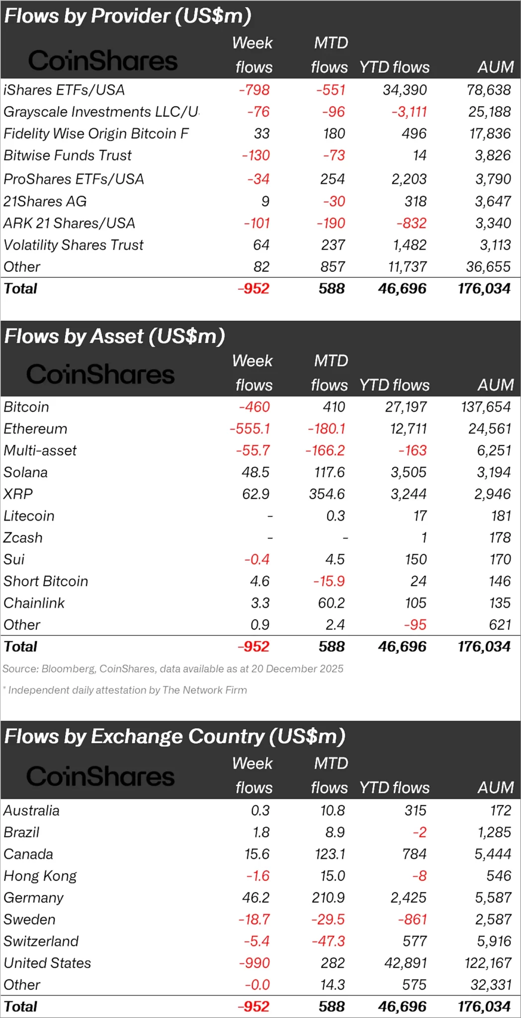 Bitcoin and altcoins continue to show weakness as the end of 2025 approaches. At this point, Bitcoin is expected to finish the year below $100,000, and Coinshares has released its weekly cryptocurrency report, stating that there was a $952 million outflow last week.
