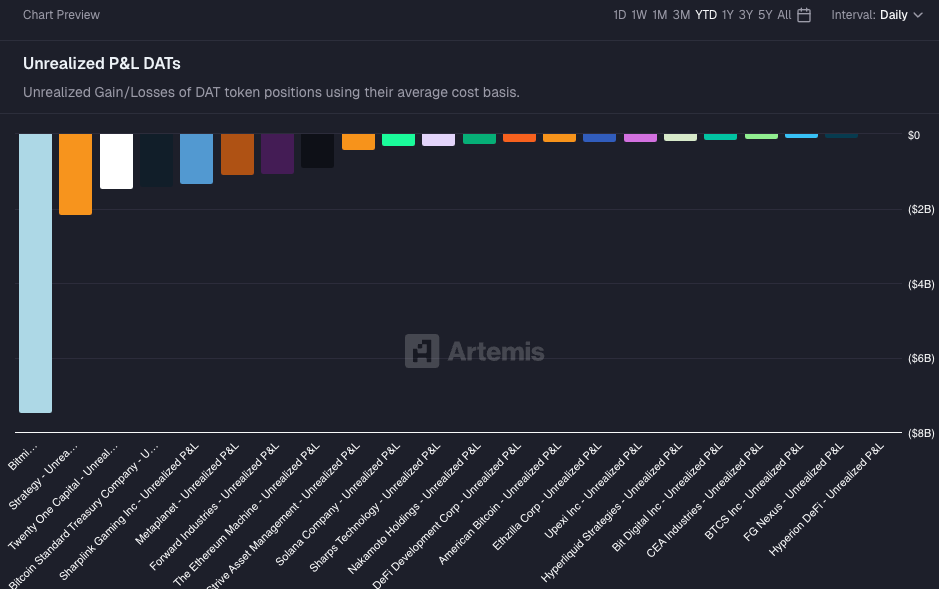 According to Artemis Terminal, the 20 largest DATs are down a cumulative $17 billion as the crypto market continues to fall.