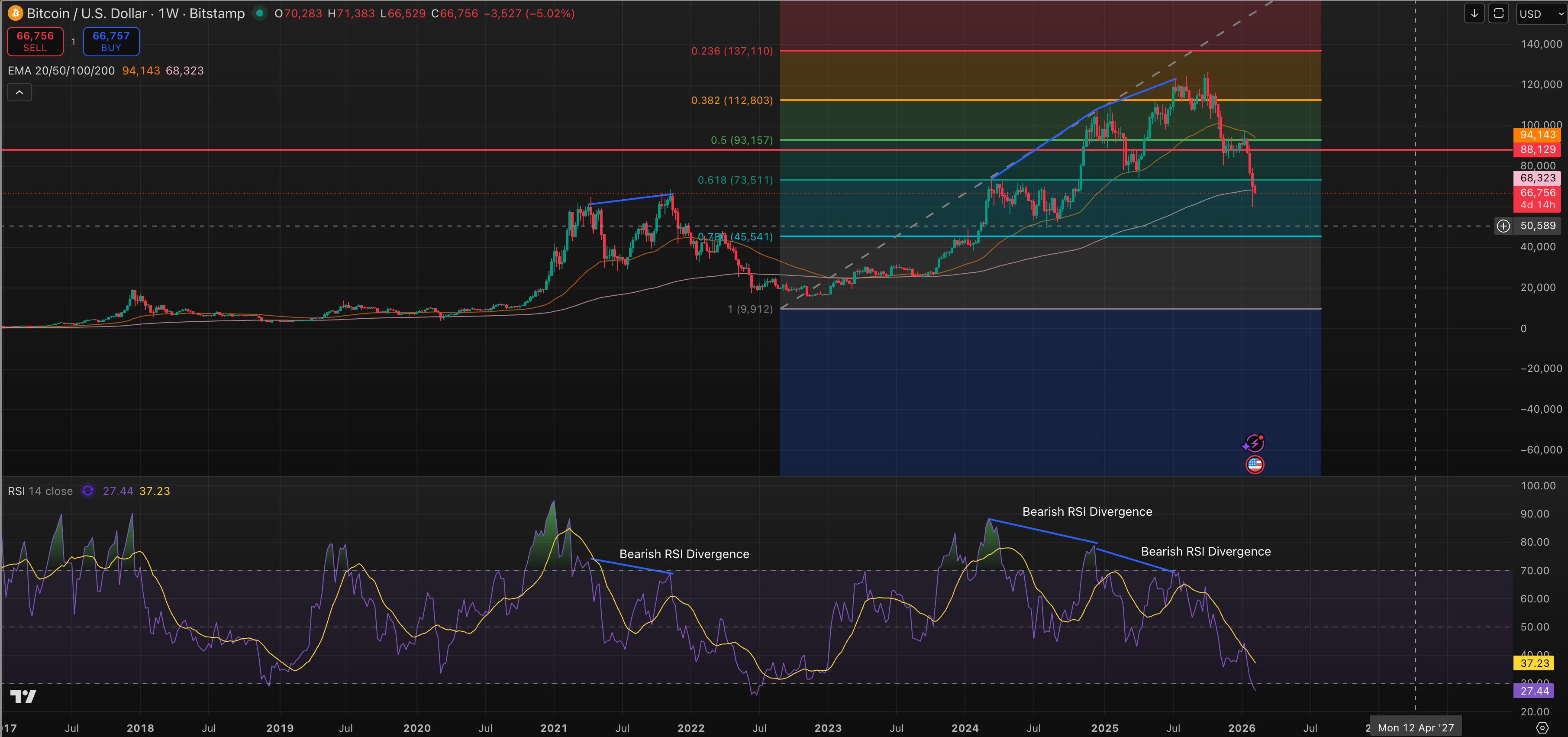 - $BTC/USD is currently hovering below the 200-week exponential moving average, a critical support level that must be reclaimed to prevent further downside.
