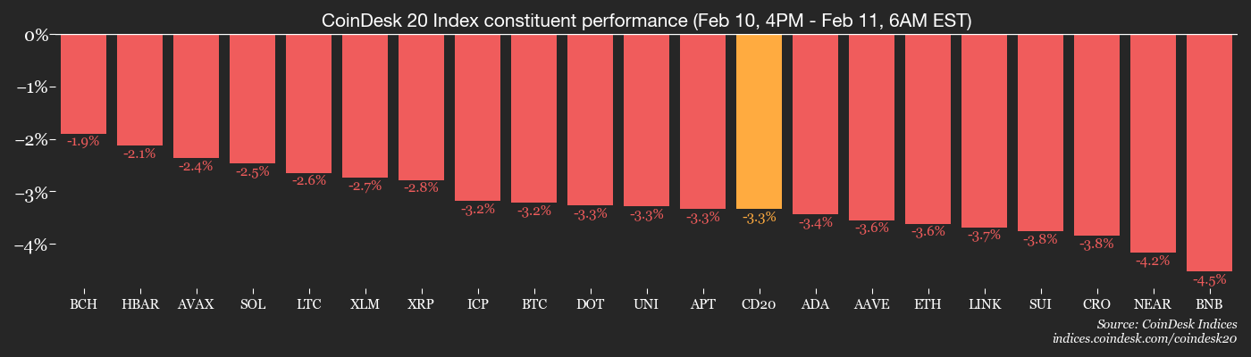 The broader crypto market capitalization has slipped to about $2.28 trillion, with the CoinDesk 20 (CD20) index losing 3.4% over the past 24 hours. Even so, onchain data aggregator Glassnode described the pullback as modest by past standards, with no signs of panic selling seen in prior cycle peaks.