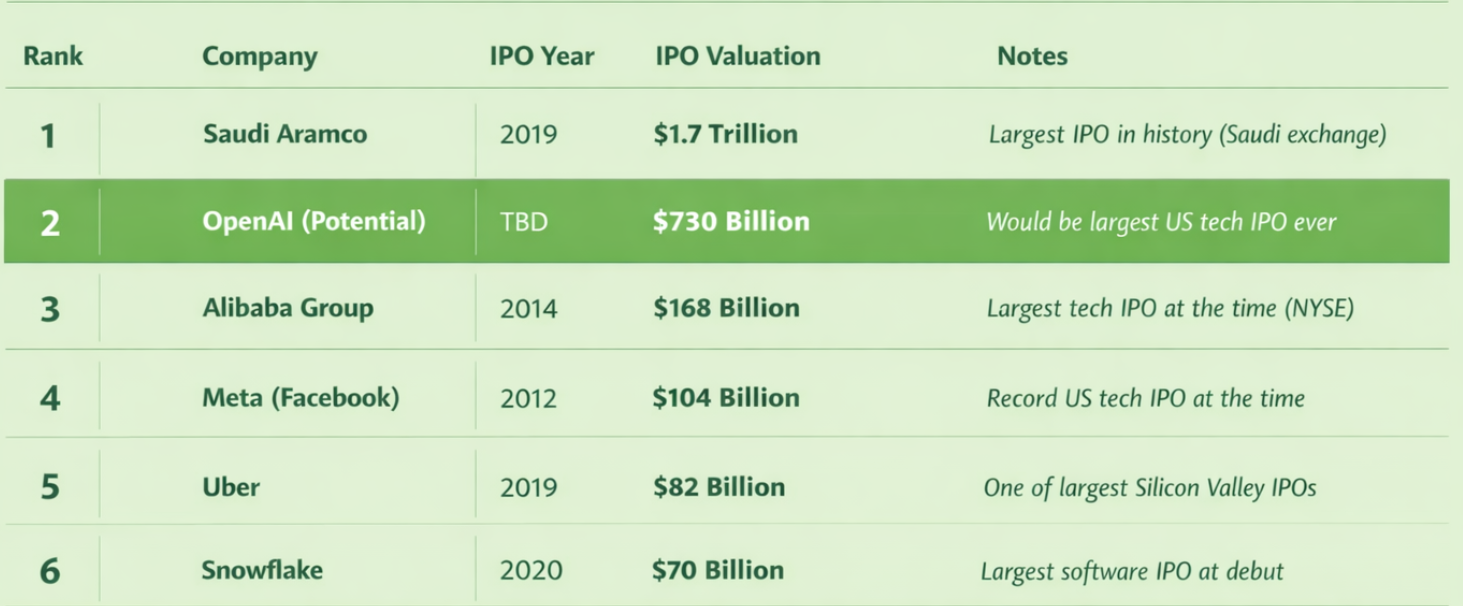 If OpenAI proceeds at this valuation, it would rank among the largest US tech IPOs ever. The scale of this funding dwarfs most historic IPO valuations.