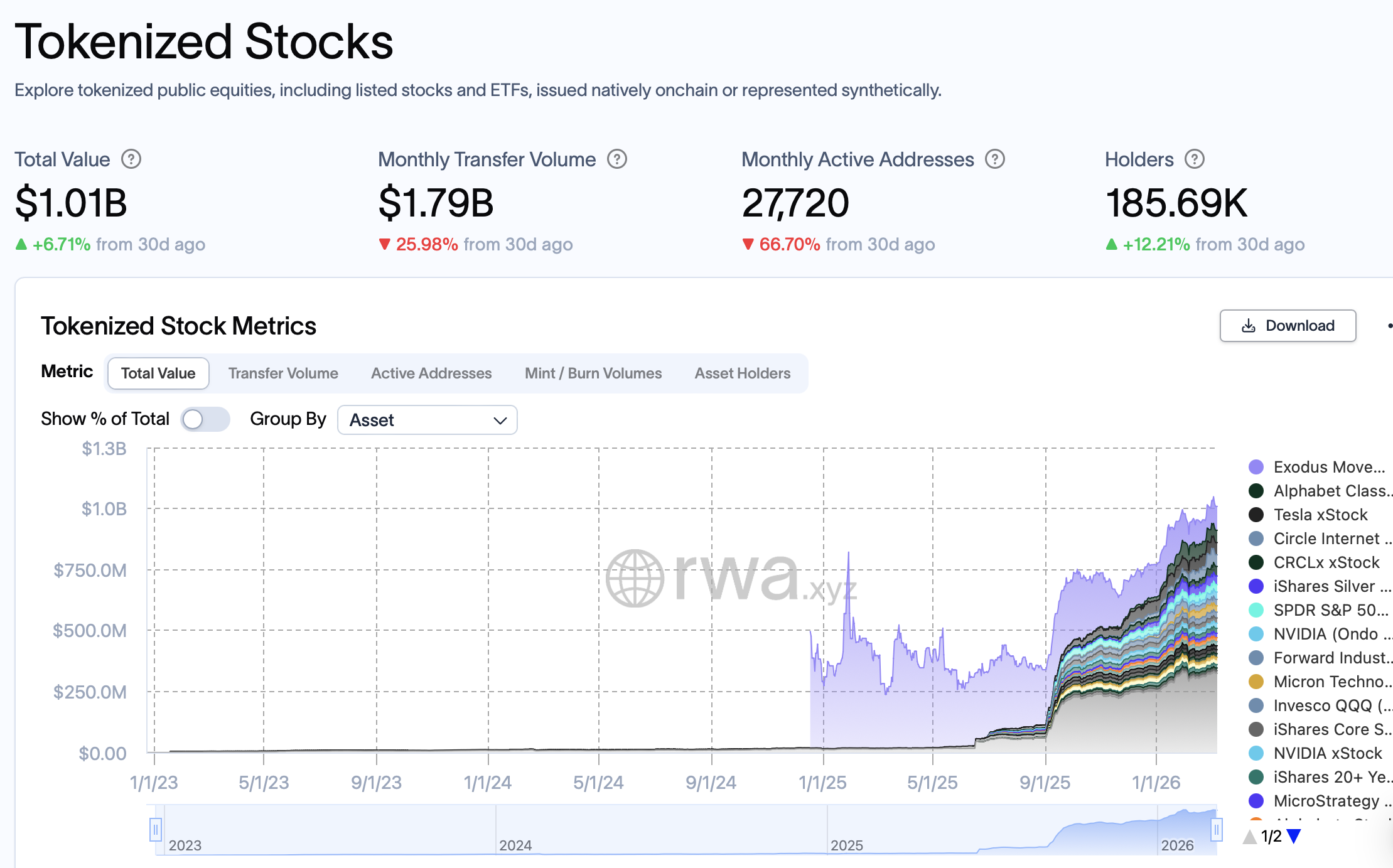 Tokenized public equities have grown to about $1.01 billion in total onchain value, according to data from RWA.xyz.